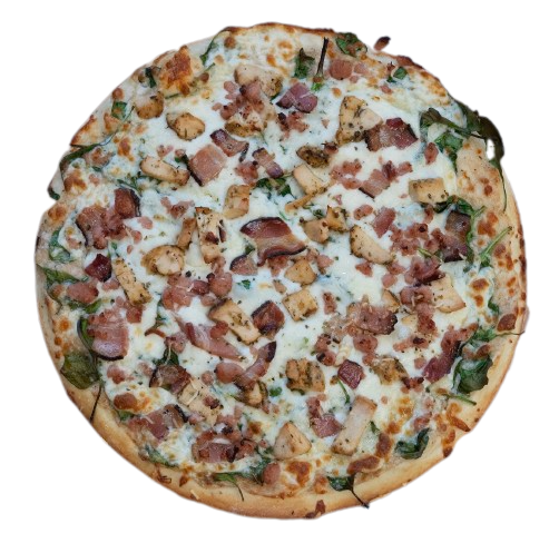 White sauce, spinach, mozzarella, chicken breast, smoked bacon, crumbled bacon, herbs, fresh garlic, Parmesan, and freshly ground black pepper.