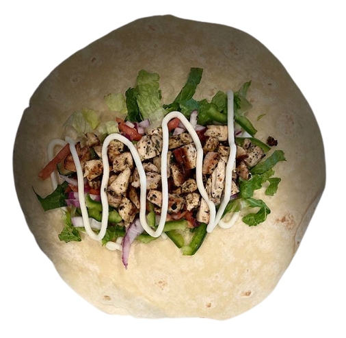 Grilled chicken breast, green pepper, lettuce, tomatoes, cucumbers, red onions & our homemade aioli. Grilled On 12″ Tortilla