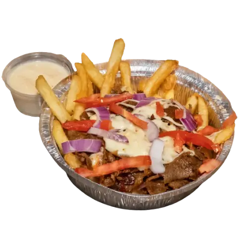 • Fries, donair meat, melted mozzarella, topped with onions, tomatoes, with donair sauce on the side.