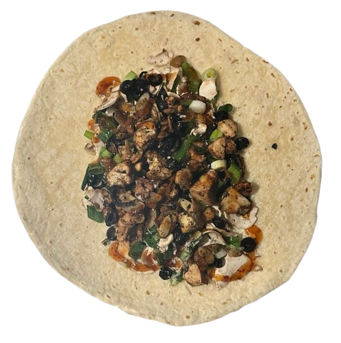 Grilled chicken breast, sliced mushroom, green onion, green pepper, black olive, roasted almonds, parmesan, and sweet & spicy Thai sauce cheese Grilled On 12″ Tortilla