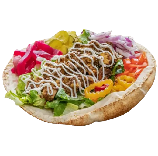 Marinated tofu, Tomato, Lettuce, Pickle, Pickled turnip, Red onion, Hot pepper & garlic sauce (On 9″ pita bread).